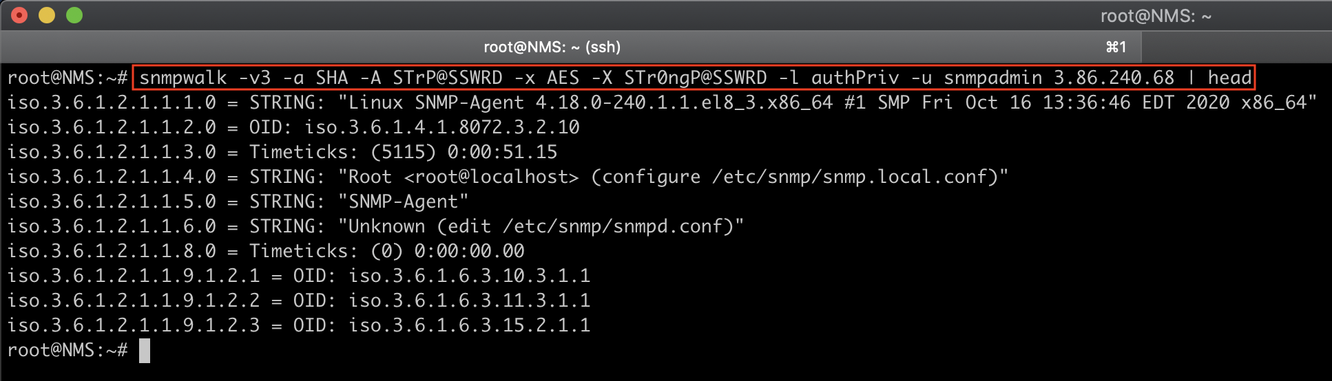 snmpwalk -v3 -a SHA -A STrP@SSWRD -x AES -X STr0ngP@SSWRD -l authPriv -u snmpadmin 3.86.240.68 | head